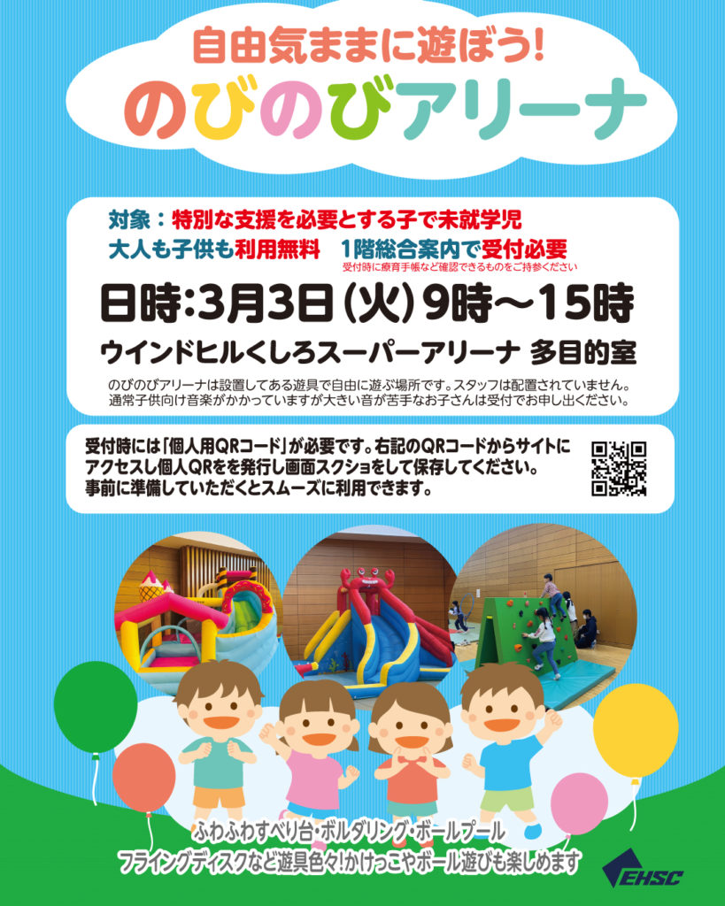 のびのびアリーナは特別な支援を必要とするお子さん限定の遊び場とさせていただきます。