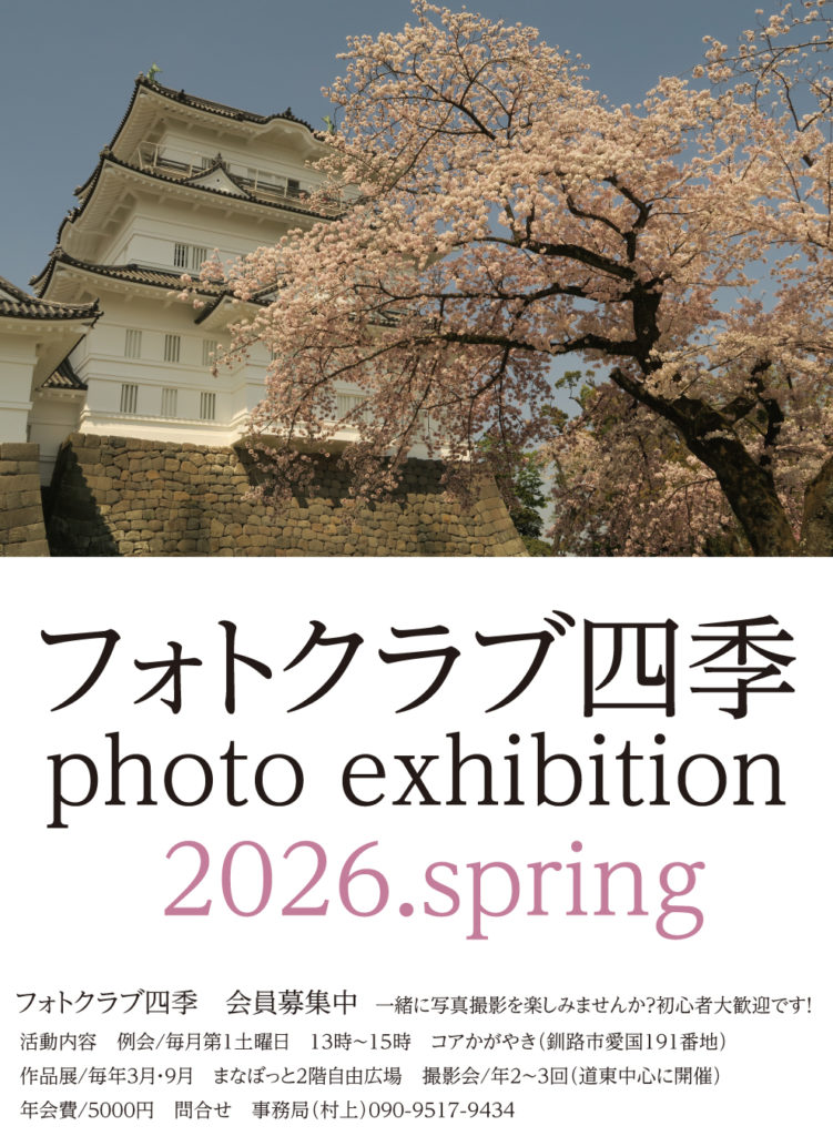 施設 写真展のお知らせ「フォトクラブ四季」 2026.03.28 4月4日(土)~5月2日(土)1階プロムナード 9時~22時 土足厳禁 観覧無料ウインドヒルくしろスーパーアリーナは入館無料です。写真展のみご覧になる事も可能です。ぜひこの機会にご来館ください。 1