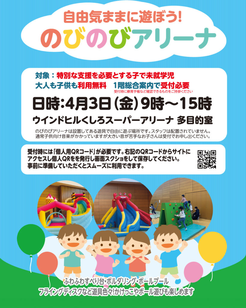 のびのびアリーナは特別な支援を必要とするお子さん限定の遊び場とさせていただきます。