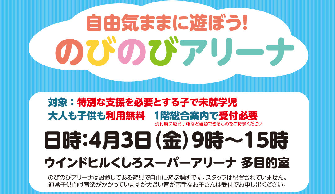 のびのびアリーナは特別な支援を必要とするお子さん限定の遊び場とさせていただきます。